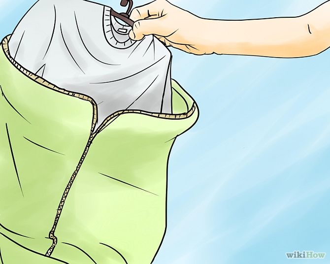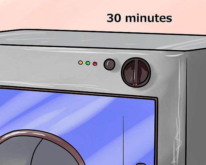 Put the dry cleaning bag inside the dryer. Make sure the lint filter is clean. Set the dryer on medium heat for 30 minutes. Use the timed setting, not the automatic setting. If your dryer does not have a medium setting, err on the side of caution and use low heat. If you are using a laundromat dryer, make sure the heat setting is adjustable and use low heat. As soon as the timer goes off, retrieve the clothes from the dryer.