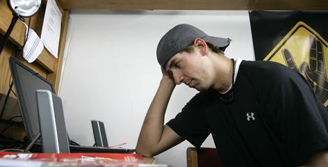 Image: Chris Smith, in 2007 a sophomore at Ohio Dominican University, looks at his blog in his dorm room in Columbus, Ohio. Smith has been unafraid to hide his preference for playing baseball over going to class or criticizing professors for assigning too much homework. Many students who come to class unprepared still end up with A's, a new survey shows.