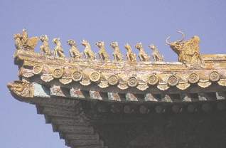Detailed animals ornament the roof lines in the Forbidden City. Led by a man riding a hen or phoenix, followed by imperial dragons, believed to ward off danger.