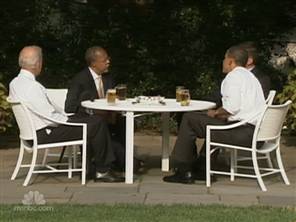 Under the canopy of a magnolia(木兰) tree Thursday evening, a shirt-sleeved(卷起袖子的) Obama joined the other players in a story that had knocked the White House off message: Harvard professor Henry Louis Gates Jr. and Cambridge, Mass., police Sgt. James Crowley. Vice President Joe Biden was also with them on a Rose Garden patio(露台).