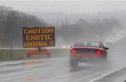 One of the escaped big cats reached an interstate highway and was hit by a car. Authorities posted electronic warning signs, "Caution Exotic Animals" for motorists.