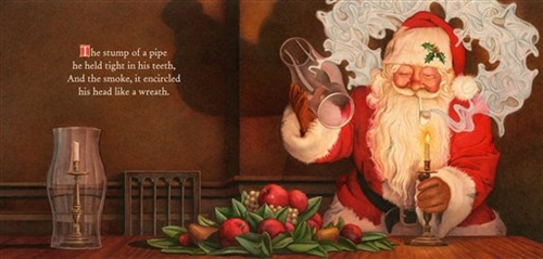 This illustration shows an image of Santa Claus smoking a pipe from the book "The Night Before Christmas," illustrated by Charles Santore. Santore's version keeps the traditional lines from the 189-year-old holiday poem by Clement C. Moore.