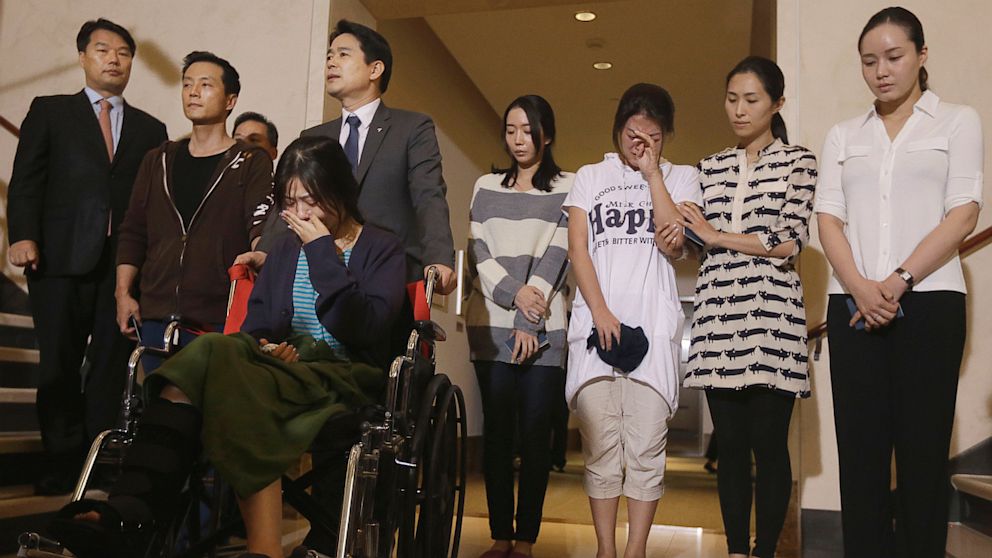 With their heads bowed and some weeping, the flight attendants surrounded cabin manager Lee Yoon Hye, who made a brief statement through a translator.