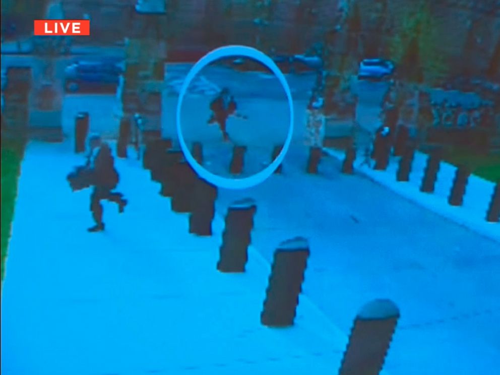 9:523.46 a.m.: He entered the Centre Block building and footage shows that there were three cars filled with members of the Royal Canadian Mounted Police pursuing him. They followed him in the building, but drop back when they heard shots being fired.