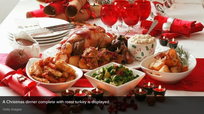 Christmas dinner is often a feast that includes turkey, ham, mashed potatoes, stuffing, rolls, veggies, salad, rolls, butter and gravy. It usually includes several glass of wine or beer, bringing the meal’s calorie count to 1730.