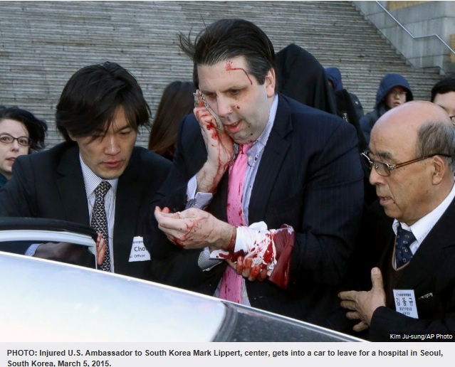 Photos from South Korea's official news agency show Ambassador Mark Lippert with blood on his hand and holding his bleeding face. A man shouted "No to war training!" before attacking him, the Yonhap news agency reported.