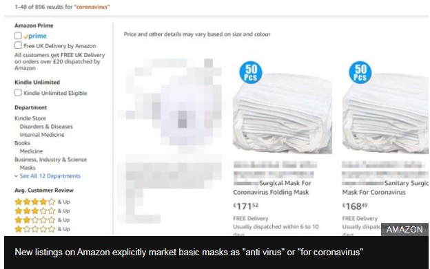 A search for "coronavirus" on Amazon brought up results for face masks, disinfectant wipes and newly-published books on viral infections, revealing how some sellers are cashing in on the health crisis.