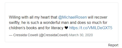 Cressida Cowell, author of the How to Train Your Dragon series, said she hoped he would "recover swiftly".