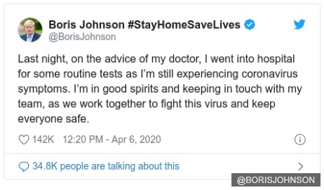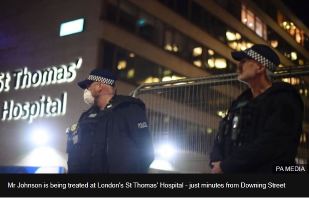 A No 10 statement read: "The prime minister has been under the care of doctors at St Thomas' Hospital, in London, after being admitted with persistent symptoms of coronavirus.