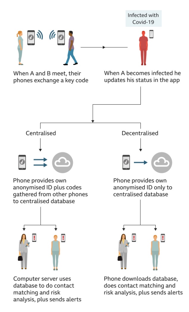 NHSX, the health service's digital innovation unit, has opted for a centralised system to power the app, so the contact-matching process happens on a UK-based computer server rather than individuals' smartphones.