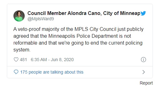 Meanwhile, councillor Alondra Cano tweeted that "a veto-proof majority" in the council had agreed that the city police department "is not reformable and that we're going to end the current policing system".