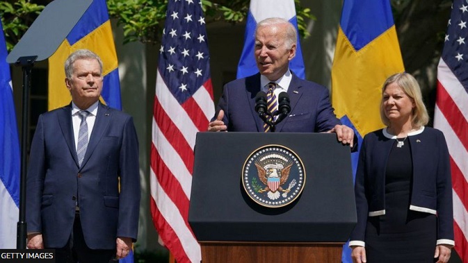 Speaking alongside Swedish Prime Minister Magdalena Andersson and Finnish Prime Minister Sauli Niinisto at the White House on Thursday, Mr Biden called Sweden and Finland's applications "a watershed moment in European security".