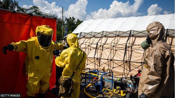 We end up at a supermarket car park where emergency workers are dressed in yellow hazmat suits. They are practising cleaning drills in the event of a radioactive contamination.