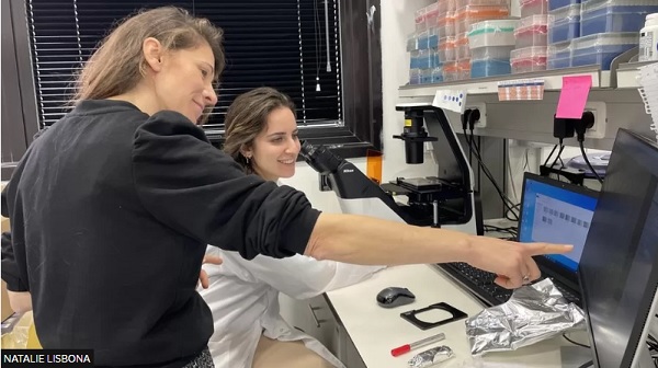 Dr Talia Cohen Solal sits down at a microscope to look closely at human brain cells grown in a petri dish.