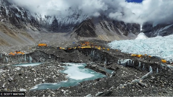 The camp sits on the Khumbu glacier which is thinning rapidly, creating risks for the hundreds of climbers who pass through every year.