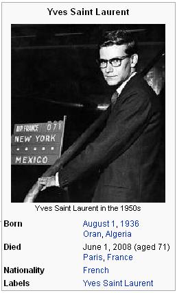 Yves Henri Donat Mathieu-Saint-Laurent, known as Yves Saint Laurent (August 1, 1936 – June 1, 2008), was an Algerian-born French fashion designer who was considered one of the greatest figures in French fashion in the 20th century. In 1985, Caroline Rennolds Milbank wrote, "The most consistently celebrated and influential designer of the past twenty-five years, Yves Saint Laurent can be credited with both spurring (刺激,鞭策) the couture's  (服装业) rise from its sixties ashes (废墟) and with finally rendering ready-to-wear reputable".