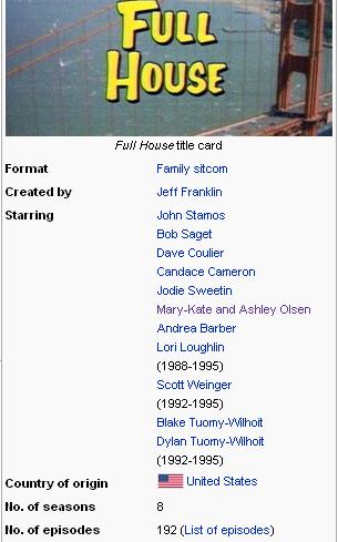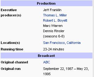 Full House is an American television sitcom that ran from September 3, 1987 to May 23, 1995 on ABC. The series was created by Jeff Franklin and produced by Lorimar Television (1987-1993), and then by Warner Brothers Television (1993-1995). Set in San Francisco, California, it chronicles (记录,记载) a father Danny Tanner who enlists (赞助,支持) one of his best friends Joey Gladstone and his brother-in-law Jesse Katsopolis to help raise his three daughters, and later on in the series Jesse's wife Rebecca Donaldson joins the household.