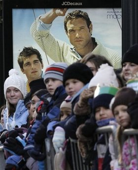 Two models in a clothing advertisement outside Macy's on State Street store, appear to be watching the Thanksgiving Day Parade with parade watchers in Chicago, Thursday, Nov. 27, 2008.