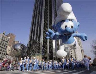 The Smurf balloon makes its way through Columbus circle during the The Macy's Thanksgiving day parade in New York, November 27, 2008.