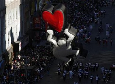 The Keith Haring Figure With Heart balloon makes its way through Times Square during the Macy's Thanksgiving Day Parade in New York November 27, 2008.