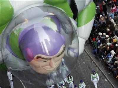 The Buzz Lightyear balloon makes its way through Times Square during the Macy's Thanksgiving Day Parade in New York, November 27, 2008.