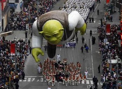 The Shrek balloon makes its way through Times Square during the Macy's Thanksgiving Day Parade in New York, November 27, 2008.