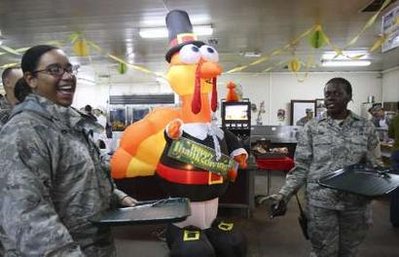 An U.S. Air Force soldier reacts to an inflatable (可吹气的) Thanksgiving turkey in the canteen of the Manas airbase near Bishkek November 27, 2008.