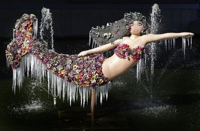 Bracing from the cold, a mermaid (美人鱼) sculpture (雕刻) drips with icicles (垂冰) outside the Nauticus maritime (航运的) and science museum in Norfolk, Va., on Saturday, Nov. 22, 2008. The sculpture, entitled 'Princess Azalea', is part of the Mermaids on Parade public art project in the city. (AP Photo/Amy Sancetta) |