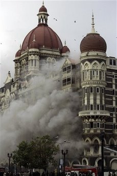 In this Nov. 29, 2008 file photo, smoke emits from the Taj Mahal Hotel in Mumbai, India. The 60-hour rampage (狂暴的行为) through India's financial capital by suspected Islamic militants that killed more than 170 people and rocked (动摇) the nation, ended Saturday, Nov. 29. The militant group suspected in the Mumbai attacks is widely believed to have been established by Pakistan's military two decades ago to fight India in the disputed region of Kashmir [克什米尔(南亚一地区,约2/5弱为巴基斯坦控制,其余为印度控制)].