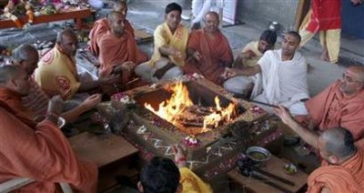 Hindu (印度教的;印度人的) saints (圣徒;圣人) offer prayers (祷告) at a temple for the victims of the Mumbai attacks in the western Indian city of Ahmedabad, November 30, 2008.
