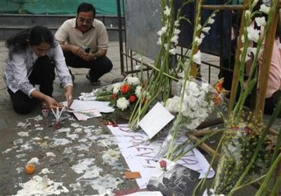 An Indian woman lights candles for victims of the Mumbai attacks in front of the Taj Mahal hotel in Mumbai November 30, 2008.