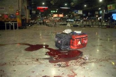 Luggages are seen near a pool (一滩,一池) of blood after shootings by unidentified (来路不明的, 不能辨认的) assailants (攻击者) at a railway station in Mumbai November 26, 2008.