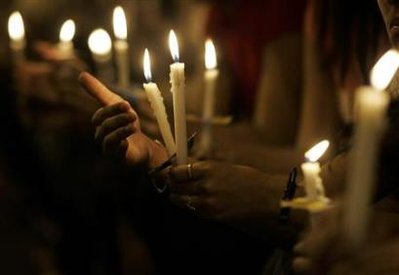 Local residents hold candles during a peace rally beside the Mumbai's landmark Marine Drive, in memory of those killed in the Mumbai terror attacks, November 30, 2008.