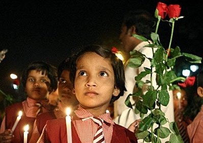 Indian schoolchildren hold flowers and candles in memory of those killed in the Mumbai attacks in Mumbai. India on Monday formally accused "elements" in Pakistan of being behind the devastating Islamic militant attacks in Mumbai and demanded that Islamabad take "strong action". (AFP/Sajjad Hussain) |