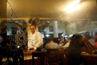As seen in the reflection of a bullet-holed mirror customers enjoy a drink at the reopened Leopold cafe, the site of one of the terror attacks, in Mumbai. India on Monday formally accused "elements" in Pakistan of being behind the devastating Islamic militant attacks in Mumbai and demanded that Islamabad take "strong action". (AFP/Pal Pillai) |