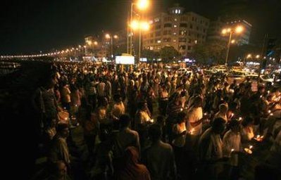 Local residents hold candles during a peace rally beside the Mumbai's landmark Marine Drive, in memory of those killed in the Mumbai terror attacks November 30, 2008.