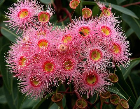The delicate pink flowers of the Corymbia "summer beauty" flowering gum from the Myrtacae family are displayed in the Sydney Royal Botanic Gardens.