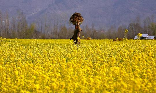 A Kashmiri Muslim woman carrying cow dung(牛粪) in a willow wicker, which is used as a manure(肥料) in fields, walks past a mustard(芥菜) field in Srinagar, Kashmir.