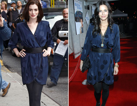 Hollywood stars love designer Marc Jacobs for his simple style. Both Anne Hathaway and Courteney Cox wore Jacob's silk "Dotty" dress; Hathaway to the "Late Show With David Letterman" Sept. 30, 2008, and Cox to the movie premiere of "Bedtime Stories" Dec. 22, 2008.