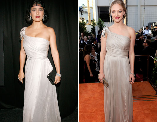Actresses Amanda Seyfried and Salma Hayek tapped into their inner-Greek goddesses when they wore this off-white silk asymmetrical Stella McCartney gown. Hayek debuted her dress at the Art of Elysium event in November 2008, and Seyfried wore it to the 2008 Golden Globes.