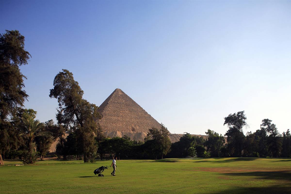 A golfer enjoys a game at the Oberoi House hotel and golfcourse near the Giza pyramid.