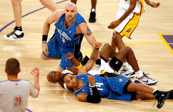 Orlando's Marcin Gortat, left, and Jameer Nelson surround Los Angeles' Lamar Odom and wait for what kind of call referee(裁判员) Steve Jaffe will make.