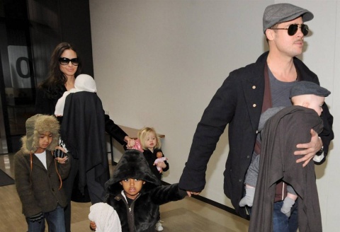 Kids: Son Knox (in Pitt’s arms), daughter Zahara (holding Pitt’s hand), daughter Vivienne (in Angelina Jolie’s arms), son Maddox (far left), daughter Shiloh (center).