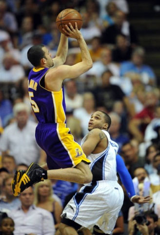 Lakers guard(后卫) Jordan Farmar goes up for a jumper in front of Magic guard Jameer Nelson. Farmar scored two points in the Lakers' win.