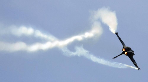 A French Air Force Dassault-made(达索公司制造的 )Rafale(21世纪法国海空军的主力战斗机) makes its demonstration run at the Paris Air Show at Le Bourget airport on Wednesday.