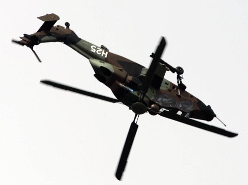 The Eurocopter-made Tiger combat helicopter performs manuvers during its demonstration run at the show.