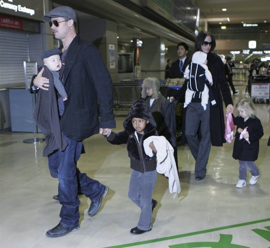 Pitt and Jolie with their children walk through Narita International Airport in Narita, east of Tokyo, Japan, on Tuesday, Jan. 27. They arrived in Tokyo for the Japan premiere of "The Curious Case of Benjamin Button." Pitt and Jolie have six children: Maddox, Zahara, Pax, Shiloh, Knox and Vivienne.