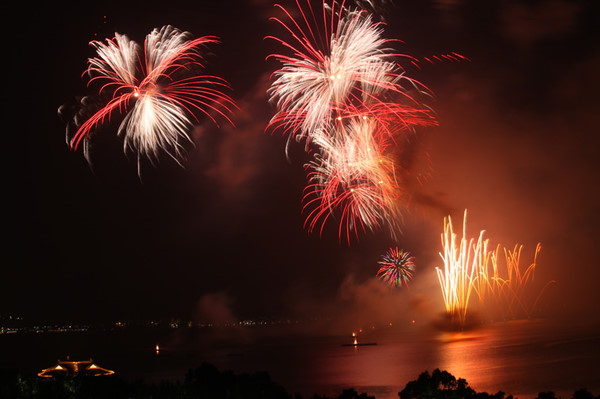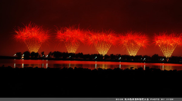 Fireworks lights the night sky and West Lake during a show of 2009 West Lake International Fireworks Fair in Hangzhou, east China's Zhejiang Province, Oct. 24, 2009.