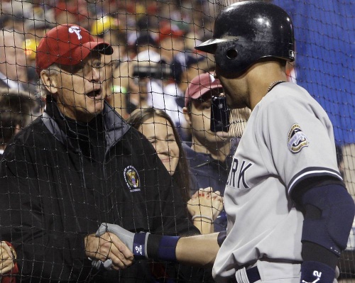 Vice President Joe Biden(乔·拜登) shakes hands with New York Yankees' (纽约洋基队)Derek Jeter(德雷克·杰特) before Game 3 of the World Series against the Philadelphia Phillies Saturday, Oct. 31, 2009, in Philadelphia.