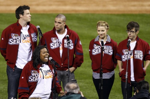 The cast of the television show 'Glee' (欢乐合唱团)sings the national anthem before Game 3 of the World Series between the New York Yankees and Philadelphia Phillies Saturday, Oct. 31, 2009, in Philadelphia.
